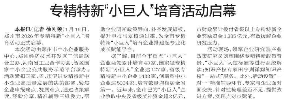 1月16日,郑州市2026年专精特新“小巨人”培育活动正式启幕。