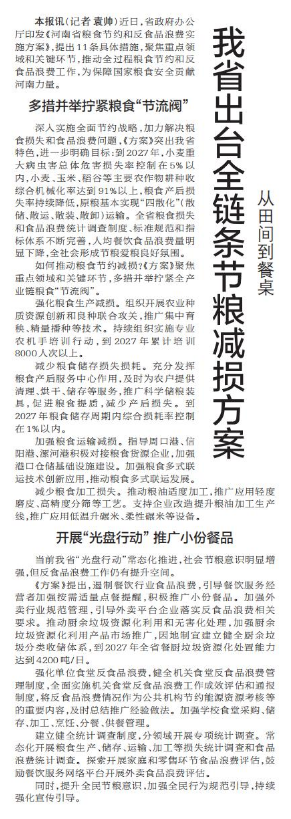 近日,省政府办公厅印发《河南省粮食节约和反食品浪费实施方案》,提出11条具体措施,聚焦重点领域和关键环节,推动全过程粮食节约和反食品浪费工作,为保障国家粮食安全贡献河南力量。(今日《郑州日报》1版)