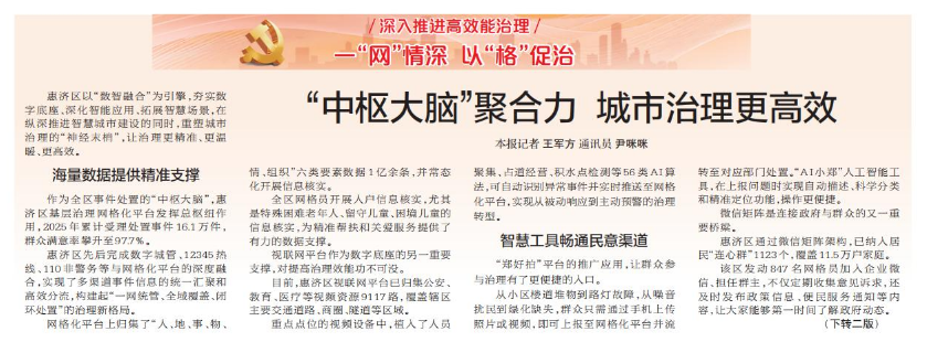 惠济区以“数智融合”为引擎,夯实数字底座、深化智能应用、拓展智慧场景,在纵深推进智慧城市建设的同时,重塑城市治理的“神经末梢”,让治理更精准、更温暖、更高效。(今日《郑州日报》1版、2版)