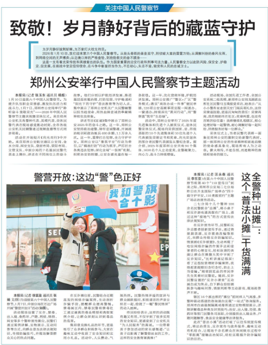 1月10日是第六个中国人民警察节。为提升队伍职业荣誉感,激发队伍活力和战斗力,1月7日,郑州市公安局举行“聆听奋斗 致敬荣光”——2026年中国人民警察节主题庆祝暨荣休仪式。来自郑州公安机关各警种代表、英模代表、荣休民警代表在现场感受激动时刻,全市各级公安机关民辅警通过视频直播等方式同步观看。(今日《郑州日报》2版)
