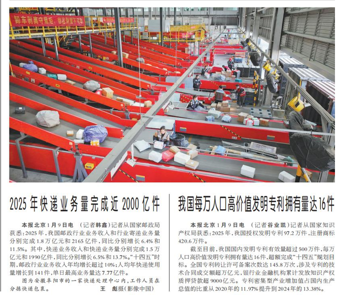 记者从国家邮政局获悉:2025年,我国邮政行业业务收入和行业寄递业务量分别完成1.8万亿元和2165亿件,同比分别增长6.4%和11.5%。其中,快递业务收入和快递业务量分别完成1.5万亿元和1990亿件,同比分别增长6.5%和13.7%。“十四五”时期,邮政行业业务收入年均增长超过10%;人均年快递使用量增长到141件,单日最高业务量达7.77亿件。(今日《人民日报》1版)