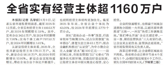 1月9日,记者从省市场监管局获悉,截至2025年12月底,全省实有经营主体1160.53万户,较2024年同期增长2.9%。其中,实有企业343.6万户,较2024年同期增长7.98%;实有个体工商户797.53万户,较2024年同期增长1.01%。(今日《河南日报》1版、2版)