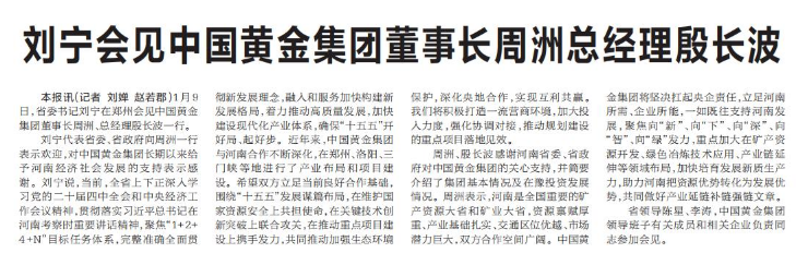 1月9日,省委书记刘宁在郑州会见中国黄金集团董事长周洲、总经理殷长波一行。(今日《河南日报》1版)