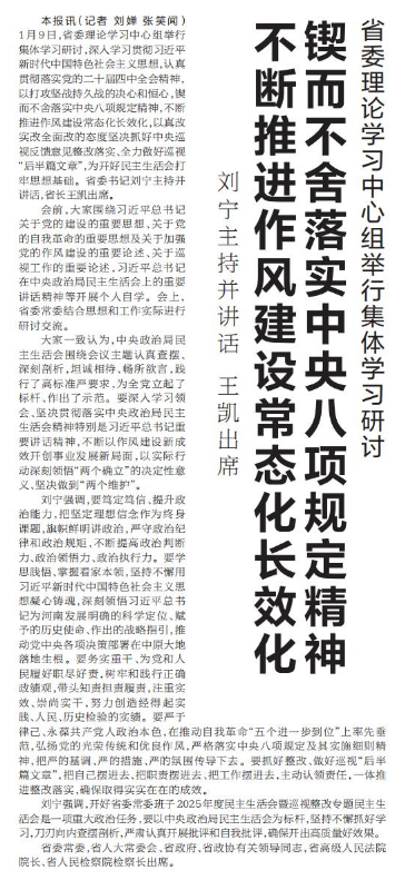 1月9日,省委理论学习中心组举行集体学习研讨,深入学习贯彻习近平新时代中国特色社会主义思想,认真贯彻落实党的二十届四中全会精神,以打攻坚战持久战的决心和恒心,锲而不舍落实中央八项规定精神,不断推进作风建设常态化长效化,以真改实改全面改的态度坚决抓好中央巡视反馈意见整改落实、全力做好巡视“后半篇文章”,为开好民主生活会打牢思想基础。省委书记刘宁主持并讲话,省长王凯出席。(今日《河南日报》1版)