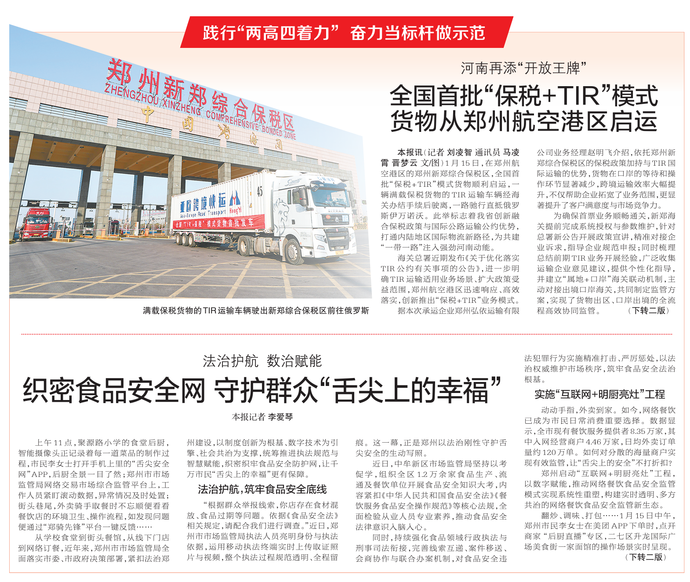 1月15日,在郑州航空港区的郑州新郑综合保税区,全国首批“保税+TIR”模式货物顺利启运,一辆满载保税货物的TIR运输车辆经海关办结手续后驶离,一路驰行直抵俄罗斯伊万诺沃。此举标志着我省创新融合保税政策与国际公路运输公约优势,打通内陆地区国际物流新路径,为共建“一带一路”注入强劲河南动能。(今日《郑州日报》1版、2版)