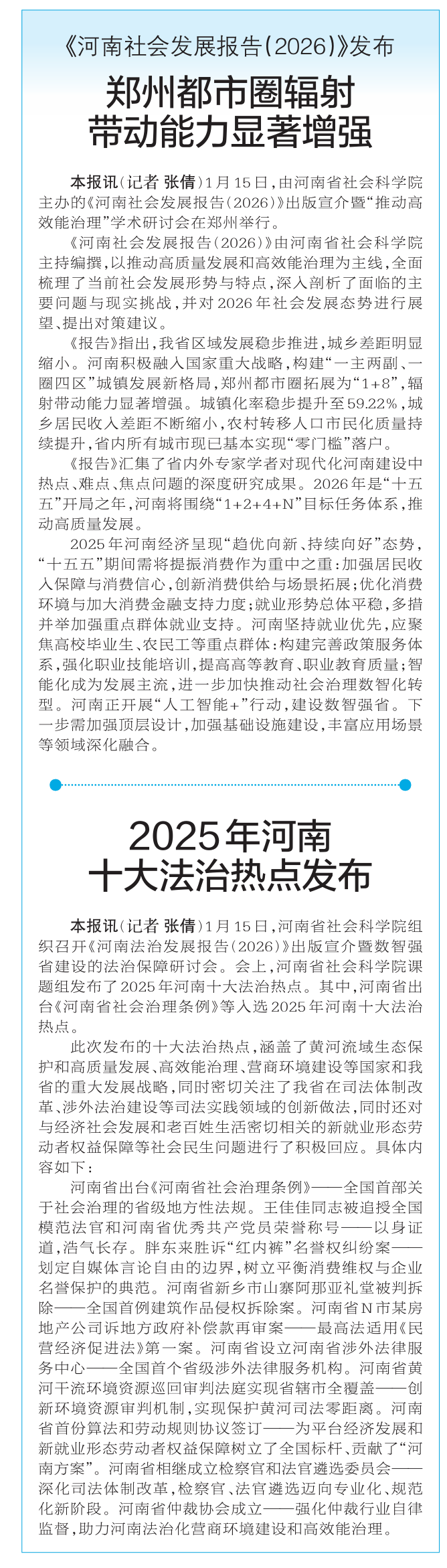 1月15日,由河南省社会科学院主办的《河南社会发展报告(2026)》出版宣介暨“推动高效能治理”学术研讨会在郑州举行。(今日《郑州日报》2版)