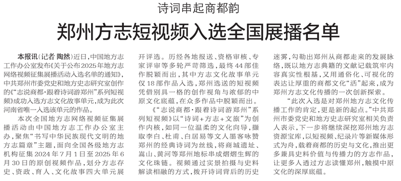 近日,中国地方志工作办公室发布《关于公布2025年地方志网络视频征集展播活动入选名单的通知》,中共郑州市委党史和地方史志研究室创作的《“志说商都·跟着诗词游郑州”系列短视频》成功入选方志文化故事单元,成为此次河南省唯一入选该单元的作品。(今日《郑州日报》2版)