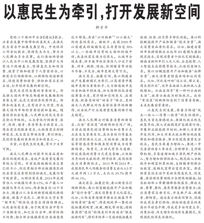 党的二十届四中全会《建议》提出,注重在发展中保障和改善民生,在满足民生需求中拓展发展空间。中央经济工作会议提出,坚持民生为大,努力为人民群众多办实事。我们要始终坚持以人民为中心的发展思想,坚持扩大内需这个战略基点,坚持惠民生和促消费、投资于物和投资于人紧密结合,以新需求引领新供给,以新供给创造新需求,促进消费和投资、供给和需求良性互动,打开经济发展的新空间。(今日《人民日报》1版)