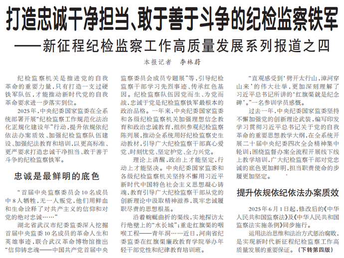 纪检监察机关是推进党的自我革命的重要力量,只有打造一支过硬铁军队伍,才能推动新时代党的自我革命要求进一步落实到位。(今日《人民日报》1版、4版)