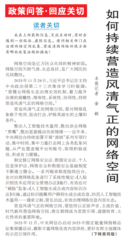 网络空间是亿万民众共同的精神家园。网络空间天朗气清、生态良好,是广大网民的共同期待。(今日《人民日报》1版、4版)