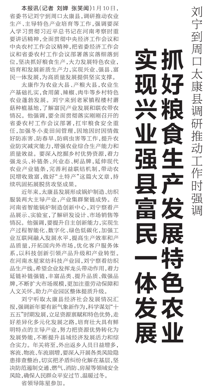 1月10日,省委书记刘宁到周口太康县,调研推动农业生产、主导特色产业培育等工作,强调要深入学习贯彻习近平总书记在河南考察时重要讲话精神,全面贯彻中央经济工作会议和中央农村工作会议精神,把省委经济工作会议和省委农村工作会议部署落实落细落到位,坚决抓好粮食生产,大力发展特色农业,培育和发展新质生产力,实现兴业、强县、富民一体发展,为高质量发展提供坚实支撑。(今日《河南日报》1版)