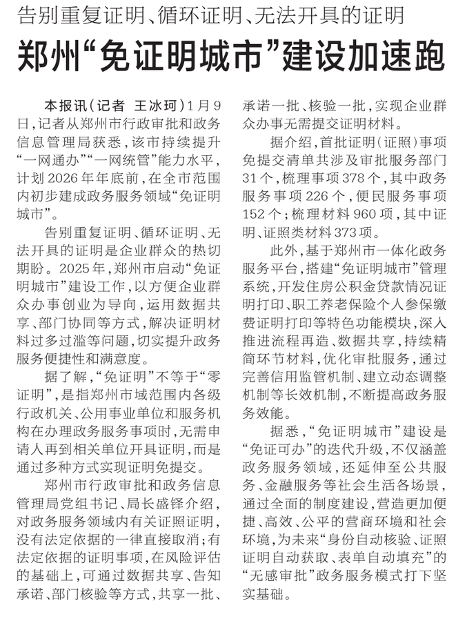 1月9日,记者从郑州市行政审批和政务信息管理局获悉,该市持续提升“一网通办”“一网统管”能力水平,计划2026年年底前,在全市范围内初步建成政务服务领域“免证明城市”。(今日《河南日报》2版)
