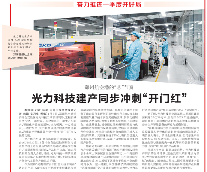 1月7日,郑州航空港经济综合实验区光力科技二期项目现场,工程机械有序作业,一派忙碌。与之紧临的一期生产车间内,智能化产线高速运转,热火朝天。一边抢建设,一边忙生产,光力科技以建产同步的奋进姿态,为我省半导体装备产业一季度“开门红”注入强劲动能。(今日《河南日报》2版)
