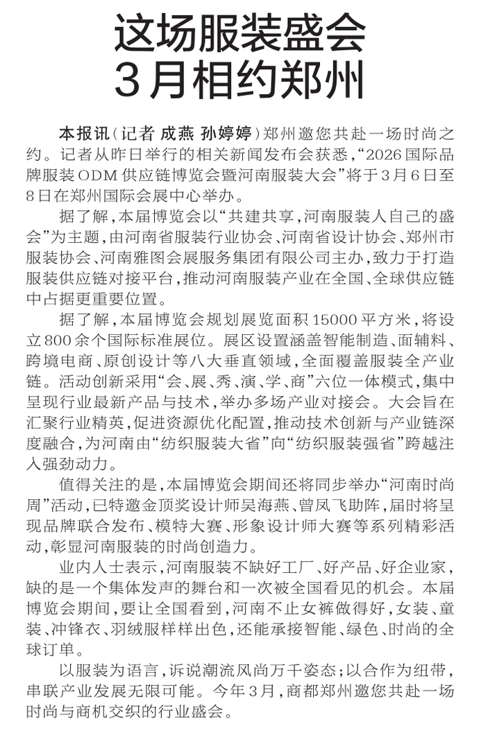 郑州邀您共赴一场时尚之约。记者从昨日举行的相关新闻发布会获悉,“2026国际品牌服装ODM供应链博览会暨河南服装大会”将于3月6日至8日在郑州国际会展中心举办。(今日《郑州日报》1版)
