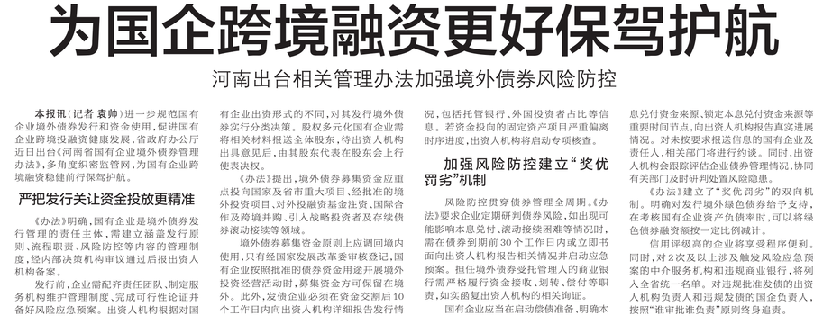 进一步规范国有企业境外债券发行和资金使用,促进国有企业跨境投融资健康发展,省政府办公厅近日出台《河南省国有企业境外债券管理办法》,多角度织密监管网,为国有企业跨境融资稳健前行保驾护航。(今日《郑州日报》2版)