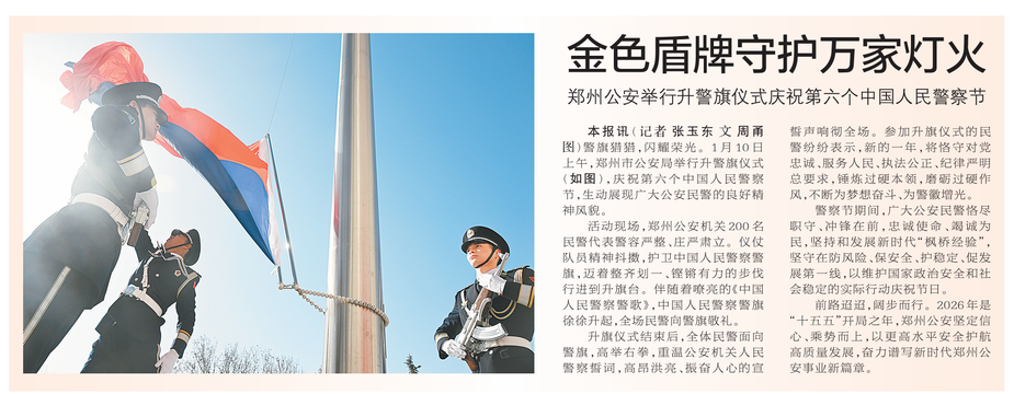 警旗猎猎,闪耀荣光。1月10日上午,郑州市公安局举行升警旗仪式,庆祝第六个中国人民警察节,生动展现广大公安民警的良好精神风貌。(今日《郑州日报》2版)