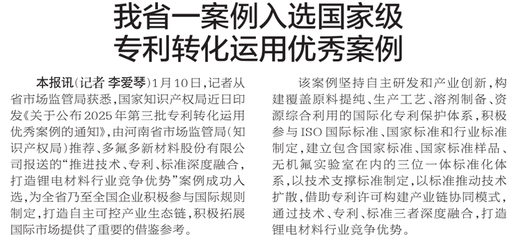 1月10日,记者从省市场监管局获悉,国家知识产权局近日印发《关于公布2025年第三批专利转化运用优秀案例的通知》,由河南省市场监管局(知识产权局)推荐、多氟多新材料股份有限公司报送的“推进技术、专利、标准深度融合,打造锂电材料行业竞争优势”案例成功入选,为全省乃至全国企业积极参与国际规则制定,打造自主可控产业生态链,积极拓展国际市场提供了重要的借鉴参考。(今日《郑州日报》2版)