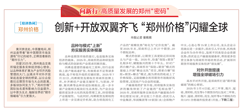 回望2025年,郑州商品交易所锚定服务实体经济核心使命,以品种体系扩展为产业叩开风险管理的大门,以高水平对外开放架起连接全球的桥梁,以公众投教拉近期货市场与大众的距离。多板块协同发力下,“郑州价格”国际知名度和影响力日益提升,以中原为支点、辐射世界的“期市强磁场”引力更强大。(今日《郑州日报》1版、2版)
