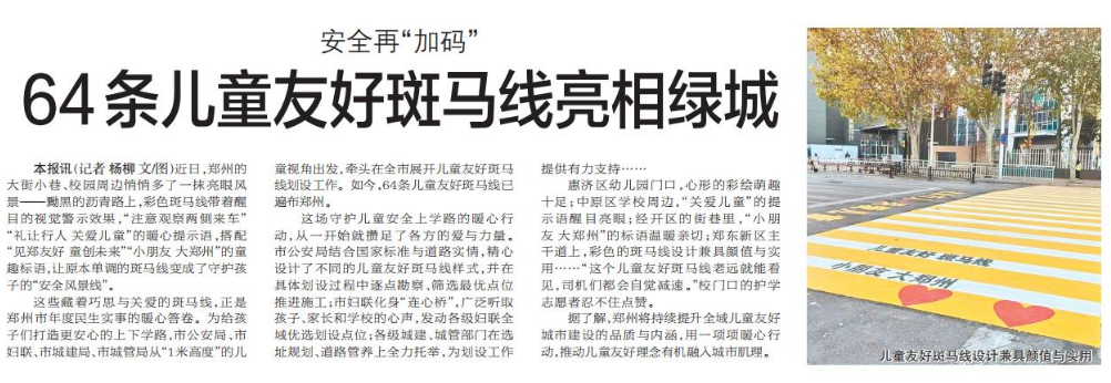 近日,郑州的大街小巷、校园周边悄悄多了一抹亮眼风景——黝黑的沥青路上,彩色斑马线带着醒目的视觉警示效果,“注意观察两侧来车”“礼让行人 关爱儿童”的暖心提示语,搭配“见郑友好 童创未来”“小朋友 大郑州”的童趣标语,让原本单调的斑马线变成了守护孩子的“安全风景线”。(今日《郑州日报》2版)