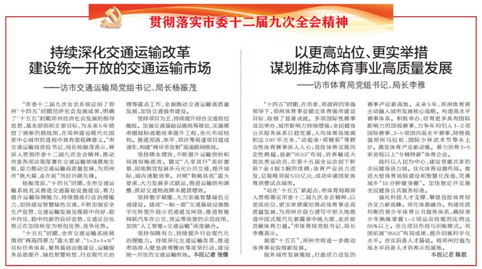 “市委十二届九次全会系统总结了郑州‘十四五’时期经济社会发展成果,明确了‘十五五’时期郑州经济社会发展的指导思想、基本原则和主要目标,为未来5年描绘了清晰的路线图,在郑州建设现代化国家中心城市的进程中具有里程碑意义。”市交通运输局党组书记、局长杨振茂表示,将深入贯彻市委十二届九次全会精神,推动市委各项决策部署在交通运输领域落地生根,奋力推动交通运输高质量发展,为郑州市“挑大梁、走在前”当好开路先锋。(今日《郑州日报》2版)