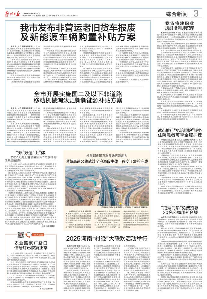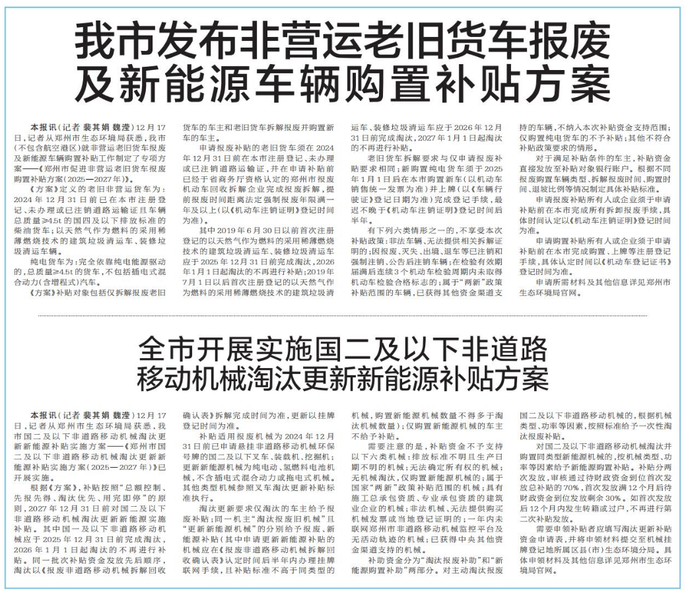 12月17日,记者从郑州市生态环境局获悉,我市(不包含航空港区)就非营运老旧货车报废及新能源车辆购置补贴工作制定了专项方案——《郑州市促进非营运老旧货车报废购置补贴方案(2025—2027年)》。(今日《郑州日报》3版)