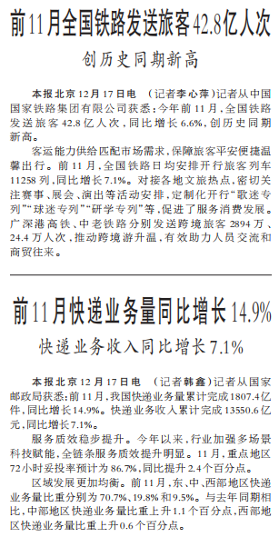 记者从中国国家铁路集团有限公司获悉:今年前11月,全国铁路发送旅客42.8亿人次,同比增长6.6%,创历史同期新高。(今日《人民日报》1版)
