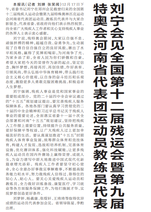 12月17日下午,省委书记刘宁在郑州会见载誉归来的全国第十二届残疾人运动会暨第九届特殊奥林匹克运动会河南省代表团运动员、教练员代表并与大家合影留念,代表省委、省政府向他们表示热烈祝贺,向全省广大残疾人工作者和关心支持残疾人事业的各界人士表示衷心感谢。(今日《河南日报》1版)