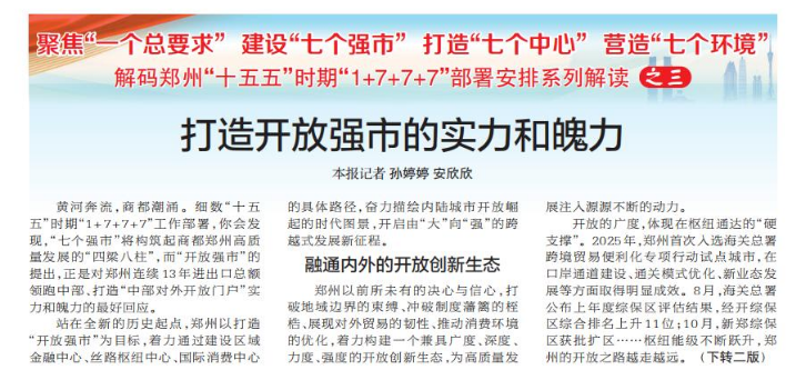 黄河奔流,商都潮涌。细数“十五五”时期“1+7+7+7”工作部署,你会发现,“七个强市”将构筑起商都郑州高质量发展的“四梁八柱”,而“开放强市”的提出,正是对郑州连续13年进出口总额领跑中部、打造“中部对外开放门户”实力和魄力的最好回应。(今日《郑州日报》1版、2版)