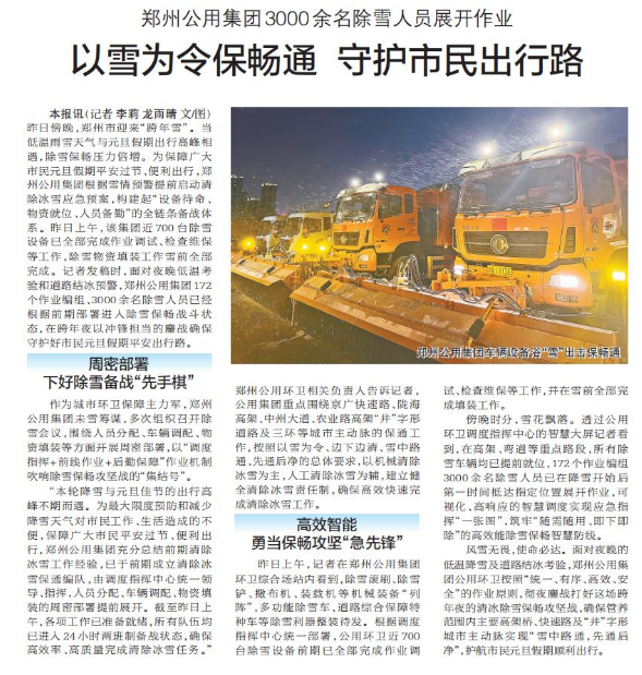 昨日傍晚,郑州市迎来“跨年雪”。当低温雨雪天气与元旦假期出行高峰相遇,除雪保畅压力倍增。为保障广大市民元旦假期平安过节、便利出行,郑州公用集团根据雪情预警提前启动清除冰雪应急预案,构建起“设备待命、物资就位、人员备勤”的全链条备战体系。昨日上午,该集团近700台除雪设备已全部完成作业调试、检查维保等工作,除雪物资填装工作雪前全部完成。记者发稿时,面对夜晚低温考验和道路结冰预警,郑州公用集团172个作业编组、3000余名除雪人员已经根据前期部署进入除雪保畅战斗状态,在跨年夜以冲锋担当的鏖战确保守护好市民元旦假期平安出行路。(今日《郑州日报》2版)