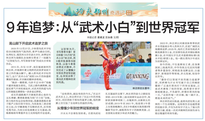 以坚韧为刃,书写青春华章!昔日体重135斤的“武术小白”林注祥,用9载淬炼演绎华丽转身,以奋斗青春诠释武术精神,不但完成了从懵懂少年到世界冠军的蜕变,也深刻诠释了塔沟武术精神的深刻内涵。(今日《郑州日报》4版)