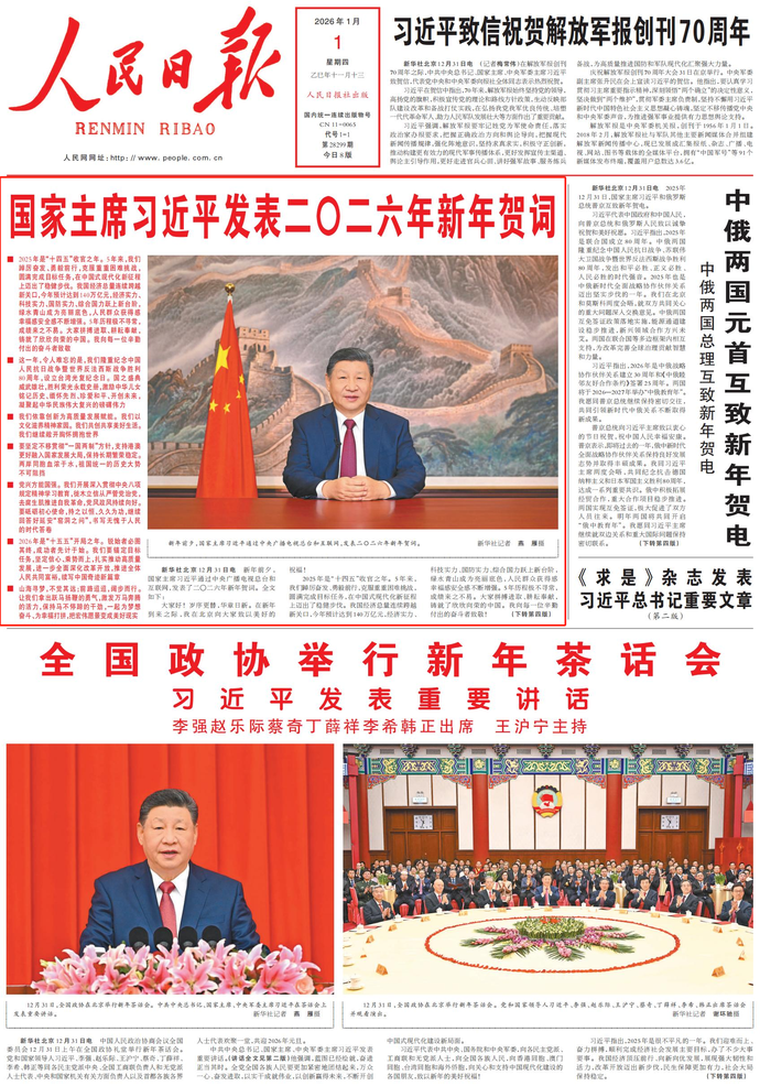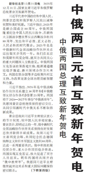 2025年12月31日,国家主席习近平和俄罗斯总统普京互致新年贺电。(今日《人民日报》1版、4版)