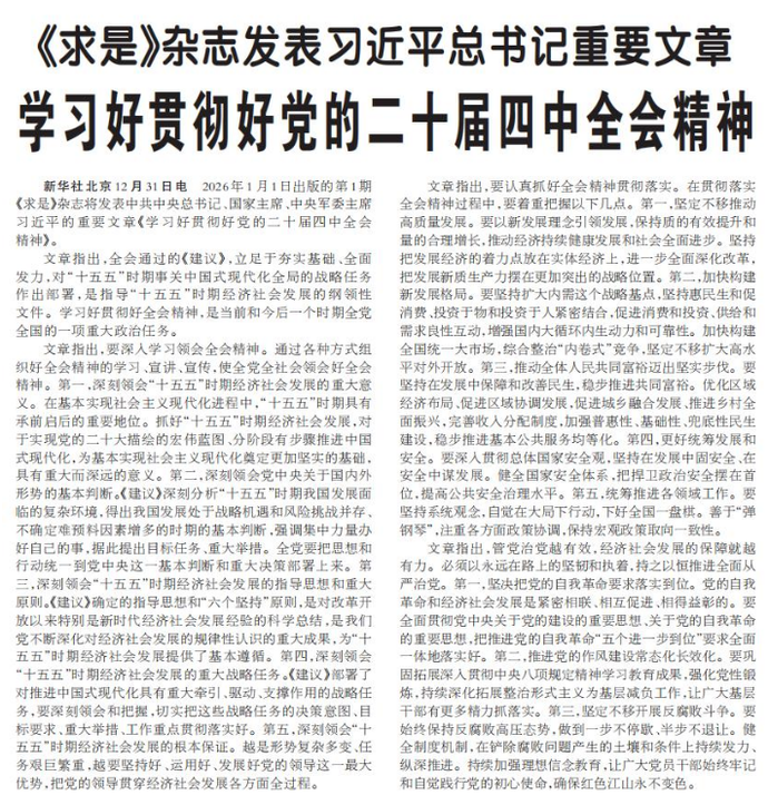 2026年1月1日出版的第1期《求是》杂志将发表中共中央总书记、国家主席、中央军委主席习近平的重要文章《学习好贯彻好党的二十届四中全会精神》。(今日《人民日报》2版)