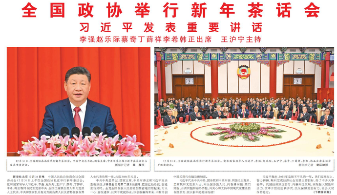中国人民政治协商会议全国委员会12月31日上午在全国政协礼堂举行新年茶话会。党和国家领导人习近平、李强、赵乐际、王沪宁、蔡奇、丁薛祥、李希、韩正等同各民主党派中央、全国工商联负责人和无党派人士代表、中央和国家机关有关方面负责人以及首都各族各界人士代表欢聚一堂,共迎2026年元旦。(今日《人民日报》1版、4版)