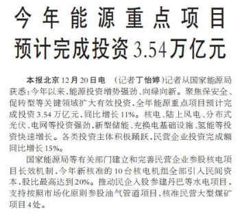 记者从国家能源局获悉:今年以来,能源投资增势强劲、向绿向新。聚焦保安全、促转型等关键领域扩大有效投资,全年能源重点项目预计完成投资3.54万亿元,同比增长11%。核电、陆上风电、分布式光伏、电网等投资强劲,新型储能、充换电基础设施、氢能等投资快速增长。各类投资主体积极踊跃,民营企业投资完成额同比增长15%。(今日《人民日报》1版)