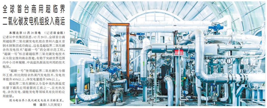记者从中核集团获悉:12月20日,全球首台商用超临界二氧化碳发电机组在贵州六盘水首钢水钢集团成功商运,这也是超临界二氧化碳余热发电技术“超碳一号”的全球示范工程。“超碳一号”标志着超临界二氧化碳发电技术从实验室推向商业落地,有助于突破世界范围内中小功率规模、中高温热源高效利用的技术瓶颈。(今日《人民日报》1版)