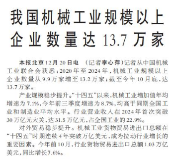记者从中国机械工业联合会获悉:2020年至2024年,机械工业规模以上企业数量从9.9万家增至13.2万家;截至今年10月底,达13.7万家。(今日《人民日报》1版)