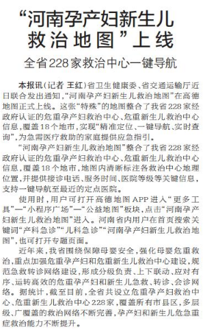“河南孕产妇新生儿救治地图”上线