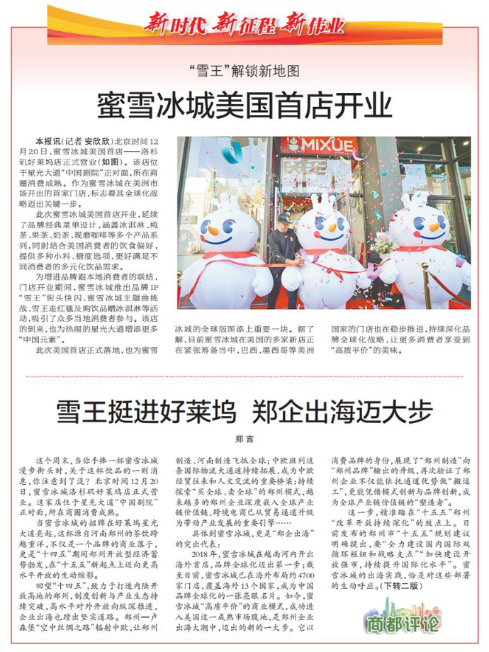 这个周末,当你手捧一杯蜜雪冰城漫步街头时,关于这杯饮品的一则消息,你注意到了没?北京时间12月20日,蜜雪冰城洛杉矶好莱坞店正式营业。这家店位于星光大道“中国剧院”正对面,所在商圈消费成熟。(今日《郑州日报》1版、2版)