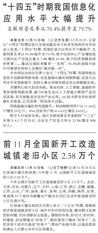 12月25日,记者从“十四五”时期信息化发展成就及电子政务发展报告发布活动上获悉:“十四五”时期,我国信息化应用水平大幅提升,互联网普及率从70.4%提升至79.7%,数字经济核心产业增加值占国内生产总值比重从7.8%增至10.4%,数字经济规模稳居世界第二。建成全国政务服务“一张网”,92.5%的省级行政许可事项实现网上受理和“最多跑一次”。(今日《人民日报》1版)