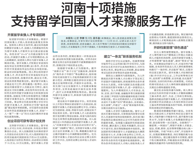 来豫就业,纳入我省就业政策支持体系;来豫创业,可享专项计划支持资助……12月25日,记者从省人社厅获悉,省委组织部、省委金融办、省人社厅等部门共同印发《河南省支持留学回国人才来豫服务工作若干措施》,十条举措吸引更多人才来到河南。(今日《郑州日报》2版)
