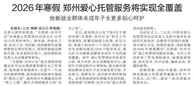 记者从团市委获悉,“共青团·伙伴计划”河南爱心托管项目启动仪式12月24日在郑州举行。团市委、市委社工部、市总工会、市妇联、郑州数智科技集团等相关单位负责人,郑州市新就业群体代表、社会组织负责人、高校团组织负责人及志愿者等参加。(今日《郑州日报》2版)