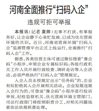 无事不打扰、有事服务好,让企业静下心来忙发展,已成为优化营商环境的共识。近日,河南省营商环境“扫码入企”监测管理平台正式上线运行,全面推行“扫码入企”工作。(今日《郑州日报》2版)