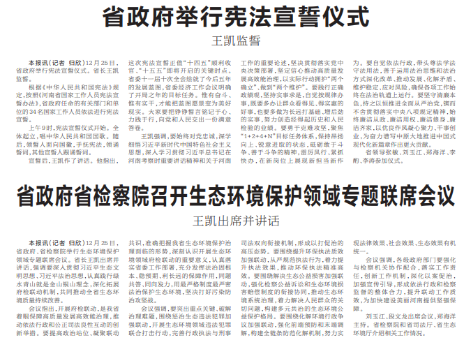 12月25日,省政府举行宪法宣誓仪式。省长王凯监誓。(今日《河南日报》1版)