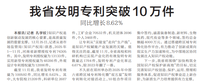 知识产权是创新驱动发展的核心要素,是高质量发展的重要支撑。12月25日,记者从省市场监管局(知识产权局)获悉,2025年1—11月,河南省新增授权专利74305件。其中,发明专利授权量为13133件,实用新型专利授权量为48286件,外观设计专利授权量为12886件。(今日《河南日报》1版)