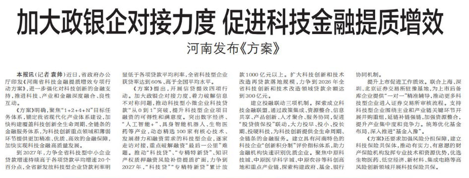 近日,省政府办公厅印发《河南省科技金融提质增效专项行动方案》,进一步强化对科技创新的金融支持,推进科技、产业和金融深度融合、良性互动。(今日《郑州日报》6版)