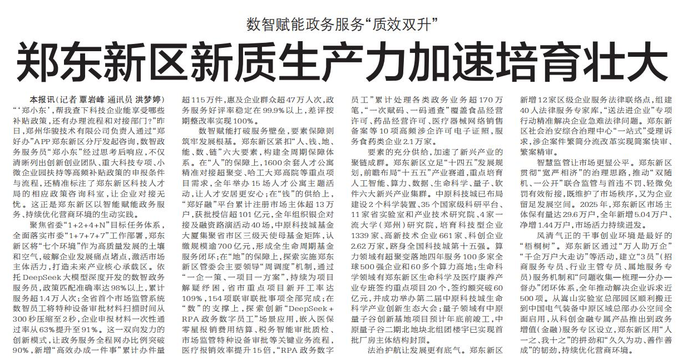 “‘郑小东’,帮我查下科技企业能享受哪些补贴政策,还有办理流程和对接部门?”昨日,郑州华骏技术有限公司负责人通过“郑好办”APP郑东新区分厅发起咨询,数智政务服务员“郑小东”经过思考后响应,不仅清晰列出创新创业团队、重大科技专项、小微企业园扶持等高频补贴政策的申报条件与流程,还精准标注了郑东新区科技人才局的相应政策咨询科室,让企业对接无忧。这正是郑东新区以智能赋能政务服务、持续优化营商环境的生动实践。(今日《郑州日报》7版)