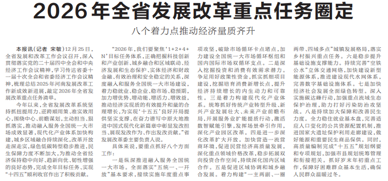 12月25日,全省发展和改革工作会议召开,深入贯彻落实党的二十届四中全会和中央经济工作会议精神,学习传达省委十一届十次全会和省委经济工作会议精神,梳理总结2025年河南发展改革工作新成效新进展,敲定2026年全省发展改革重点任务清单。(今日《河南日报》2版)