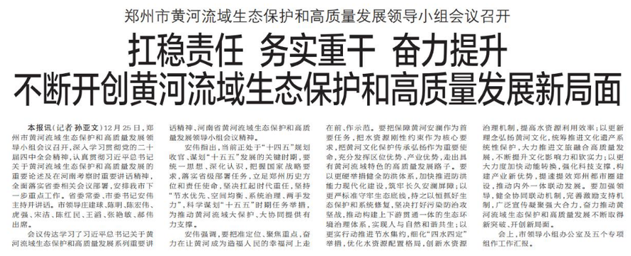 12月25日,郑州市黄河流域生态保护和高质量发展领导小组会议召开,深入学习贯彻党的二十届四中全会精神,认真贯彻习近平总书记关于黄河流域生态保护和高质量发展的重要论述及在河南考察时重要讲话精神,全面落实省委相关会议部署,安排我市下一步重点工作。省委常委、市委书记安伟主持并讲话。市领导庄建球、陈明、陈宏伟、虎强、宋洁、陈红民、王滔、张艳敏、郝伟出席。(今日《郑州日报》1版)