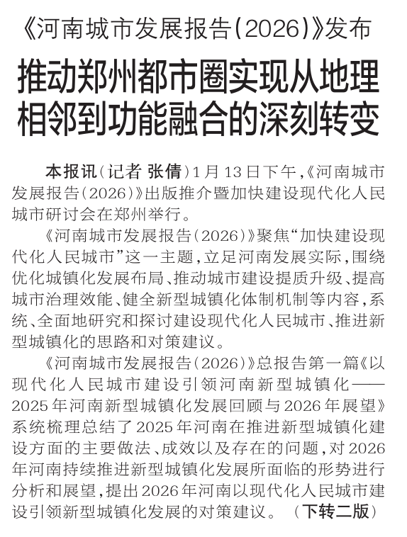 1月13日下午,《河南城市发展报告(2026)》出版推介暨加快建设现代化人民城市研讨会在郑州举行。(今日《郑州日报》1版、2版)