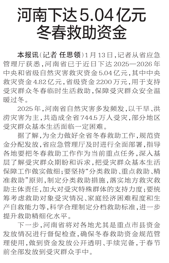 1月13日,记者从省应急管理厅获悉,河南省已于近日下达2025—2026年中央和省级自然灾害救灾资金5.04亿元,其中中央救灾资金4.82亿元,省级资金2200万元,用于支持受灾群众冬春临时生活救助,保障受灾群众安全温暖过冬。(今日《郑州日报》2版)